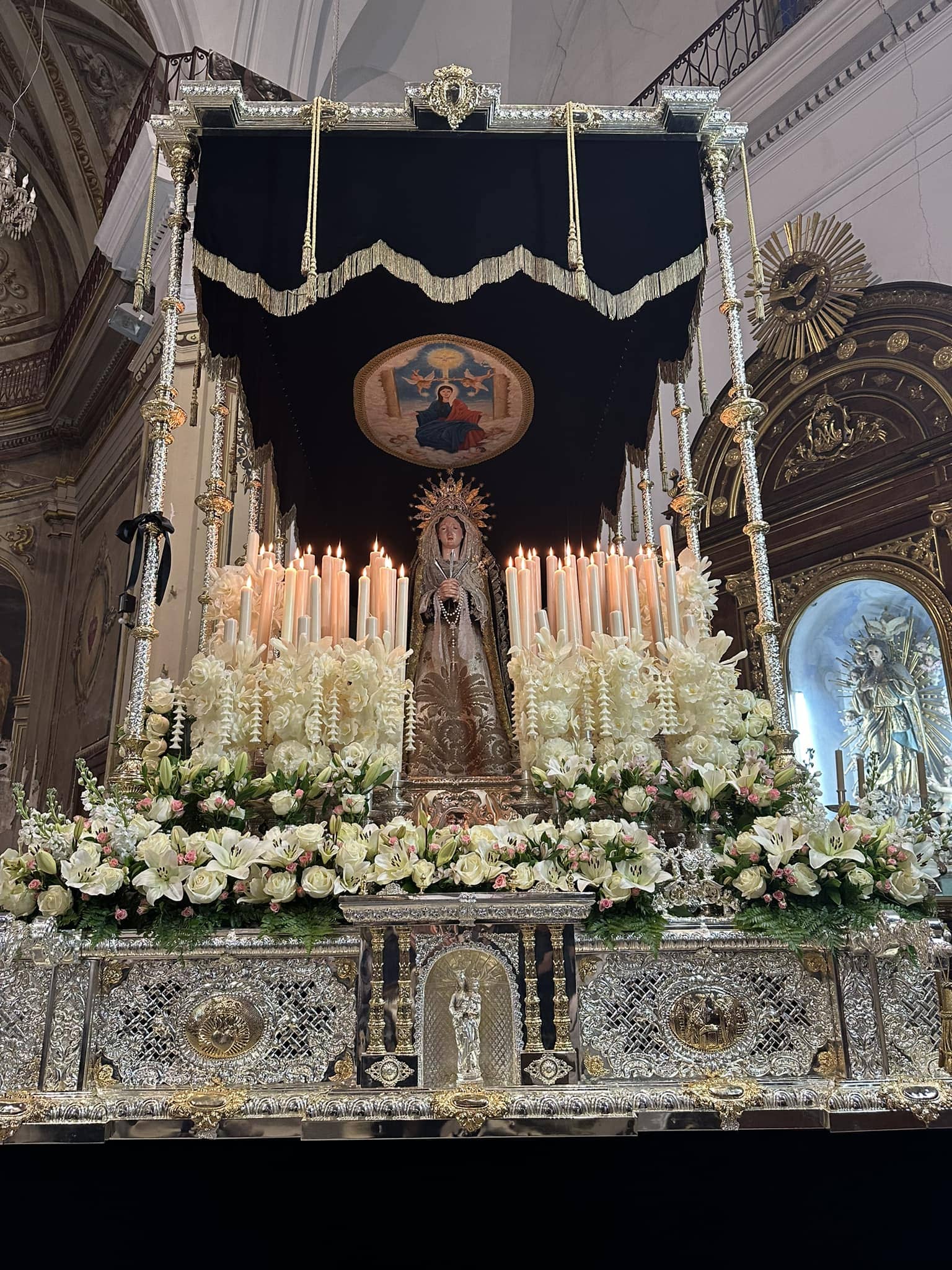 Este conjunto es portado a costal en un trono de madera tallada.